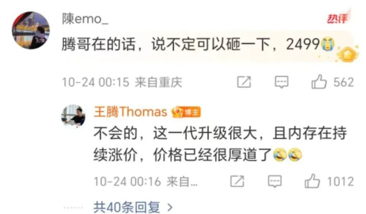 对此,已离职的前红米负责人王腾也在回复网友的时候表示,内存确实在持续涨价,自己来也不可能把价格砸下去。